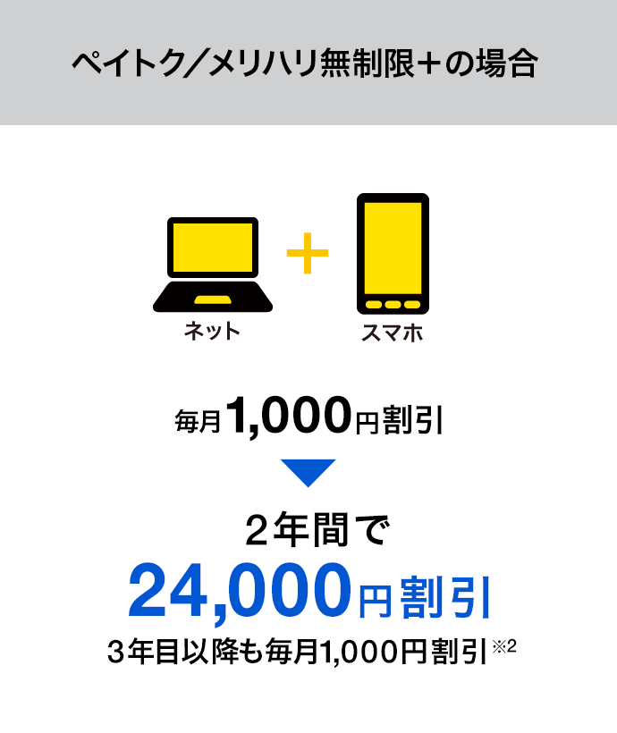 - ※2SoftBank 光、SoftBank Airの場合。3年目以降の割引額および割引の有無は対象固定通信サービスにより異なります。