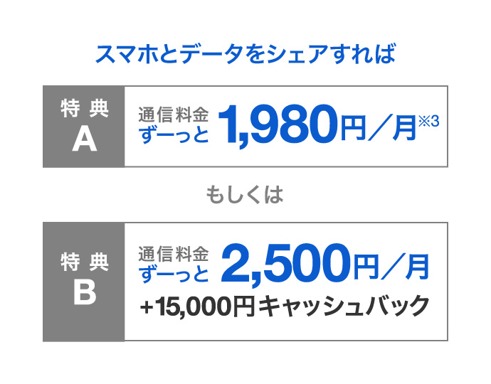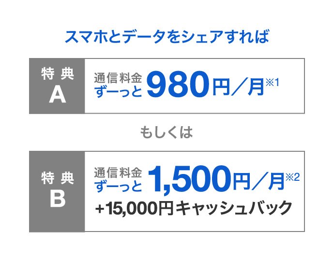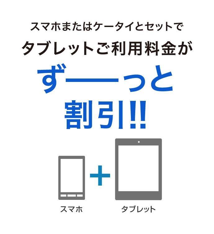 対象機種をご購入し、データシェアプラスにご加入いただいたお客さまを対象に、対象機種をご使用中の間、iPad、タブレットのタブレット基本料がずっと割引となるキャンペーンです。なお、特典A、特典Bいずれかを選択することが可能です。