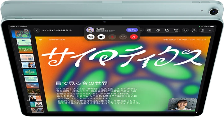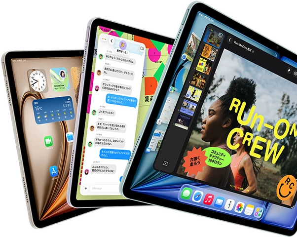 - ディスプレイ:ディスプレイは四隅が丸みを帯びています。長方形として対角線を測った場合、13インチiPad Pro は 13インチ、11インチiPad Pro は11.1インチ、13インチiPad Air は12.9インチ、11インチiPad Air とiPad(A16)は10.86インチ、iPad mini は8.3インチです。実際の表示領域はこれより小さくなります。