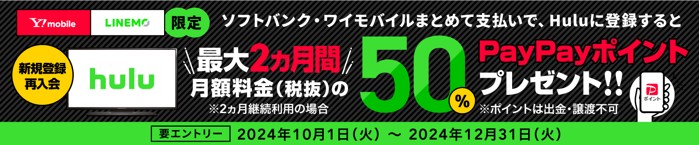 - 「合計932円分PayPayポイントプレゼント」は、特典付与条件達成月から2ヵ月間継続して「ソフトバンク・ワイモバイルまとめて支払い」でHuluの月額料金のお支払いが確認できた方が対象となります。