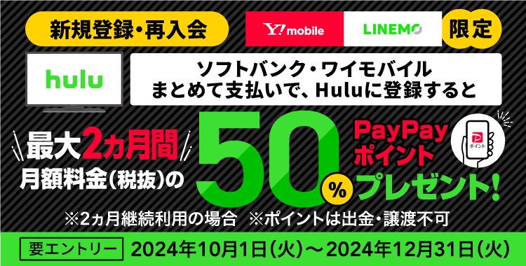 - 本サイトのエントリーフォームからのエントリーを行う際に使用する回線と、Huluの月額料金のお支払のためにソフトバンク・ワイモバイルまとめて支払いを行う際に登録する回線が異なる場合は、特典付与対象外となります。