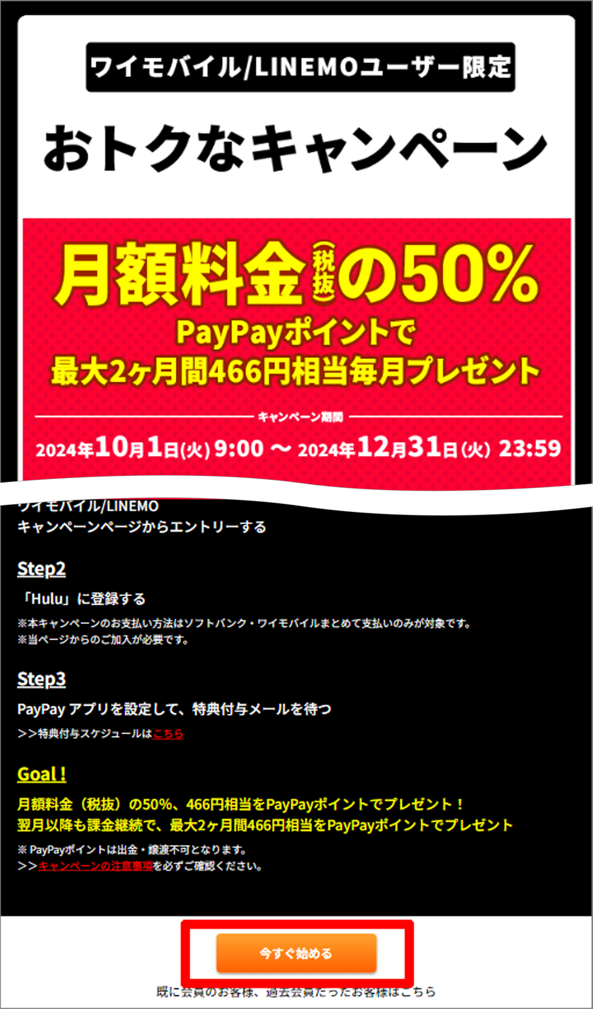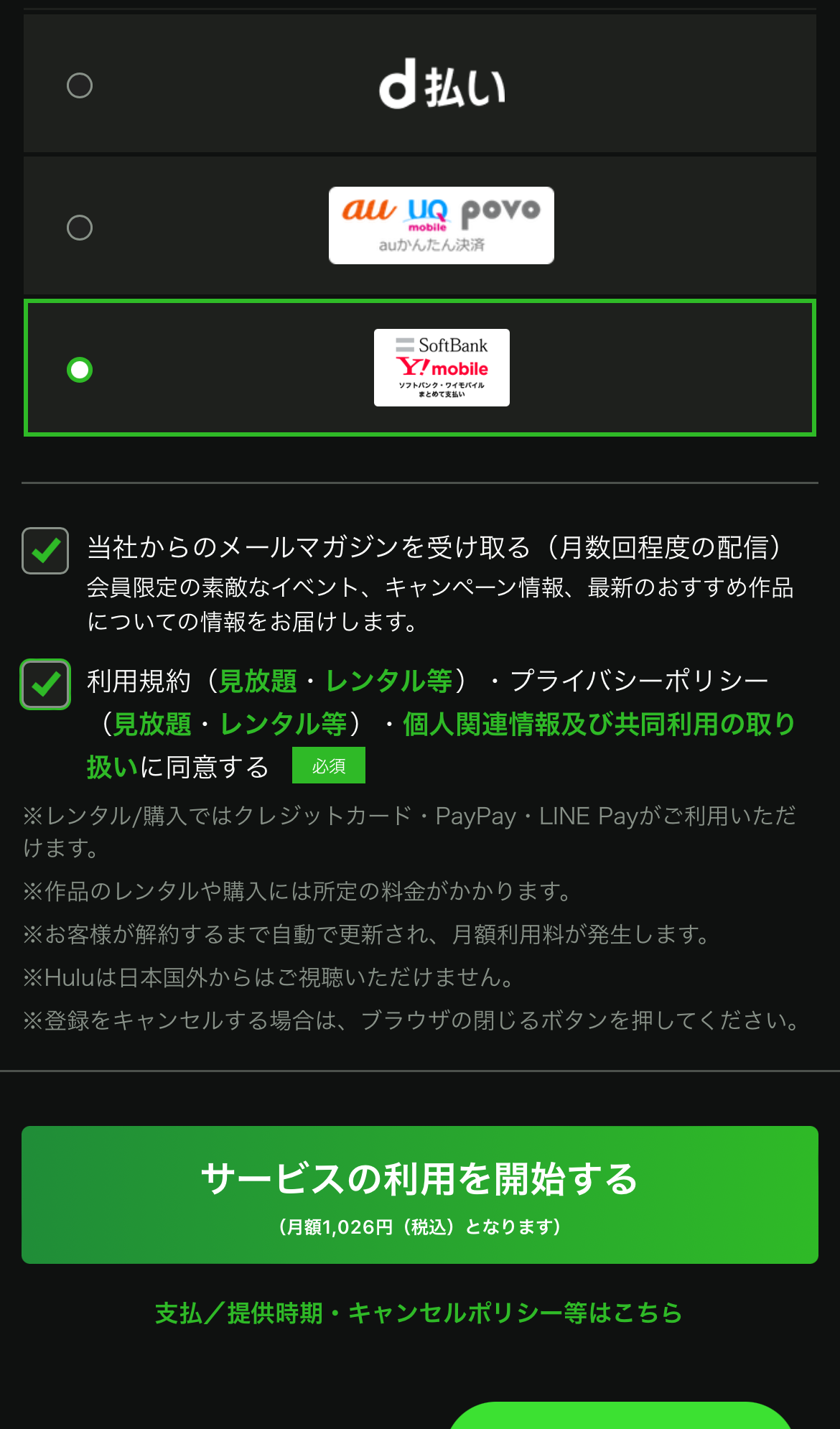 - Huluに新規入会または再入会いただき、それらの入会の際に「ソフトバンクまとめて支払い」または「ワイモバイルまとめて支払い」の方法によるお支払いを完了