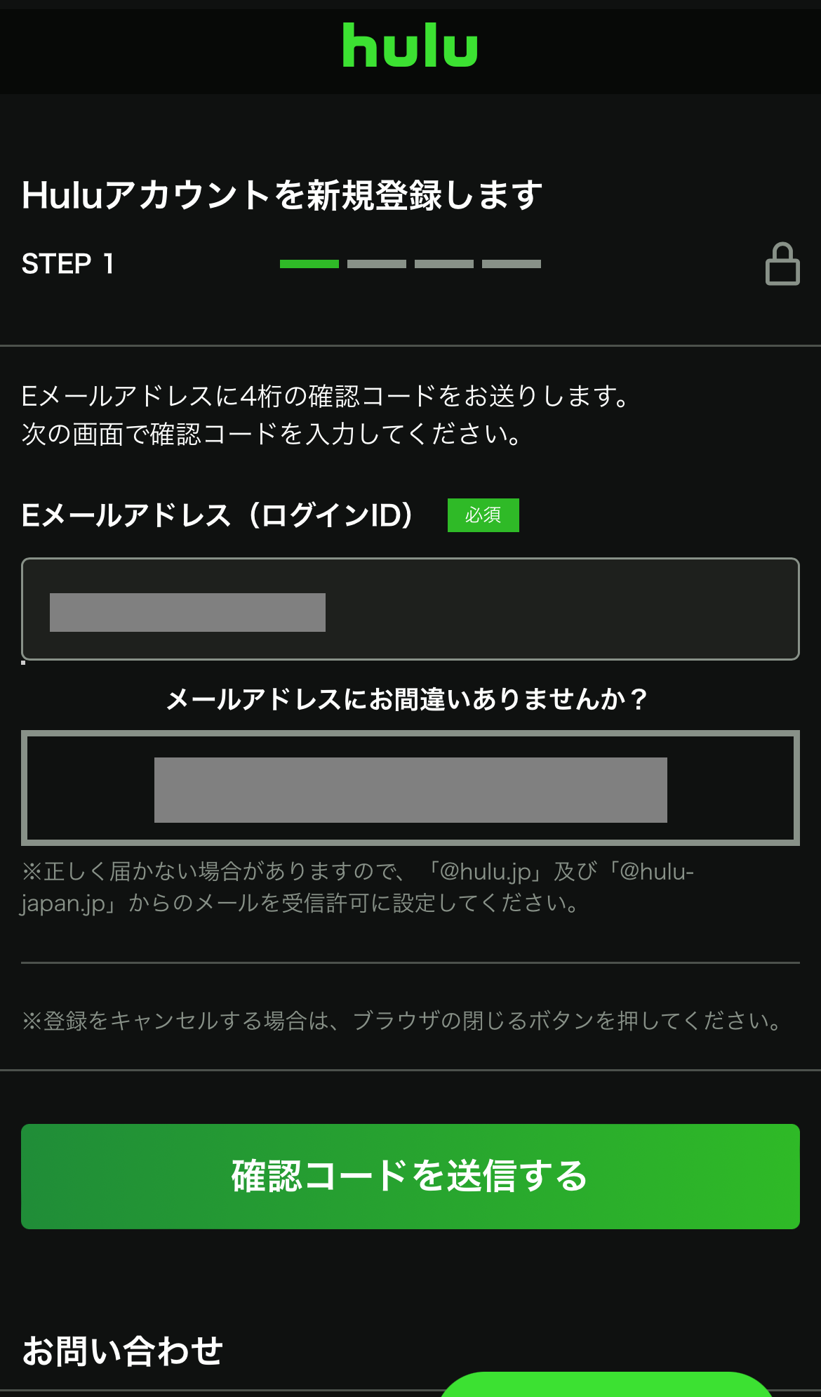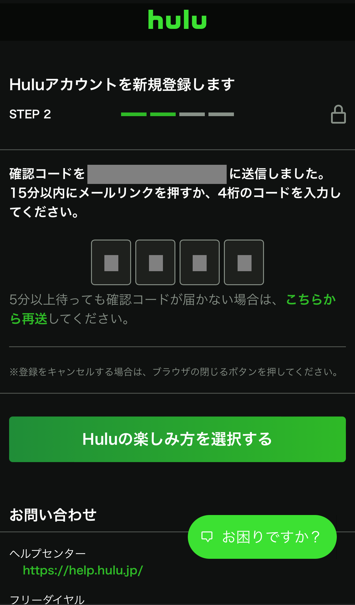 - 2.で入力したメールアドレスに届いた4桁の確認コードを入力「Huluの楽しみ方を選択する」をタップ