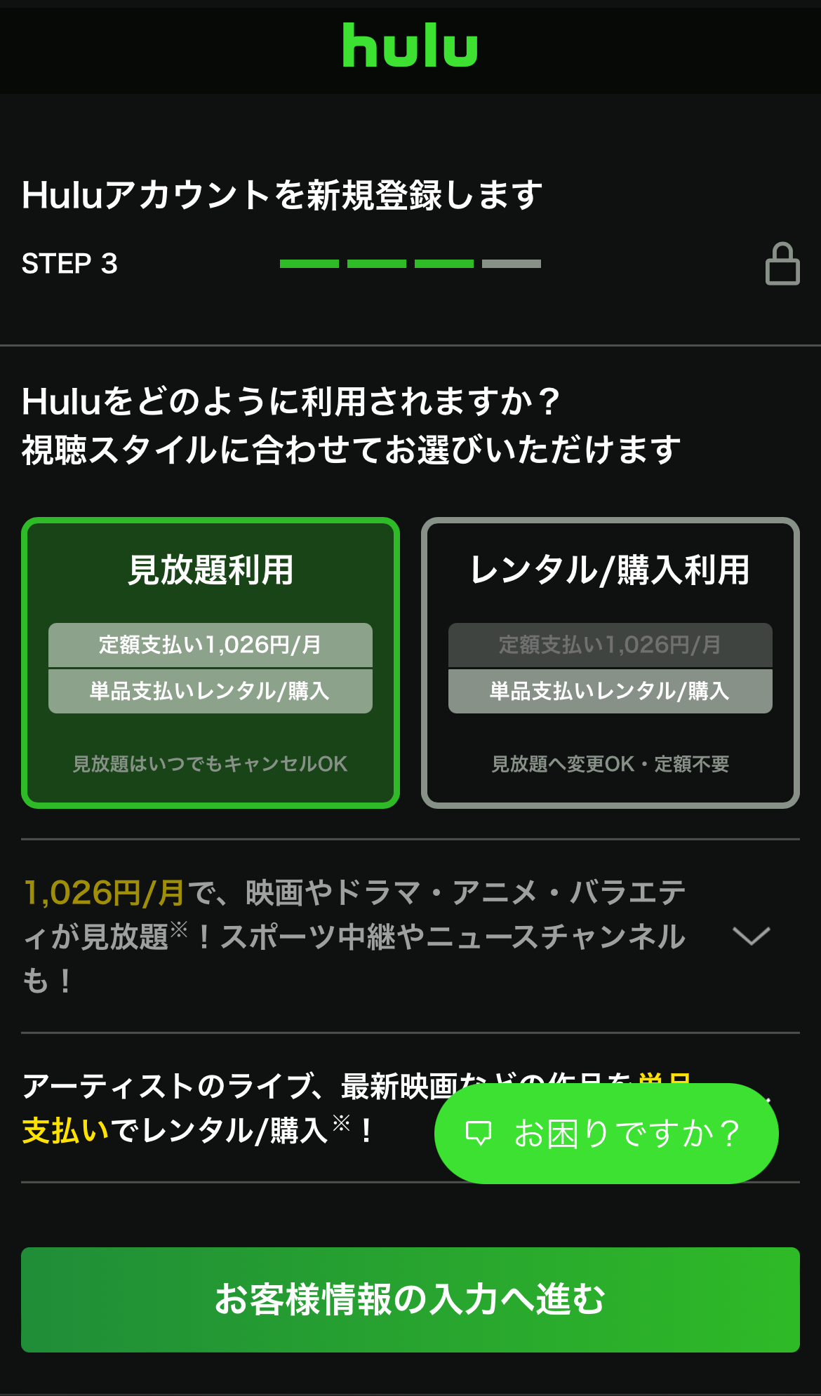 - 「見放題利用」を選択「お客様情報の入力へ進む」をタップ