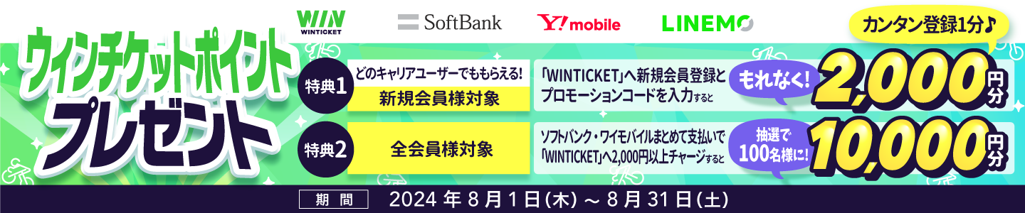 期間中、ソフトバンク・ワイモバイルまとめて支払いで、「WINTICKET」へ、1回2,000円以上チャージすると、抽選で100名さまに10,000円分のWINTICKETポイントプレゼント