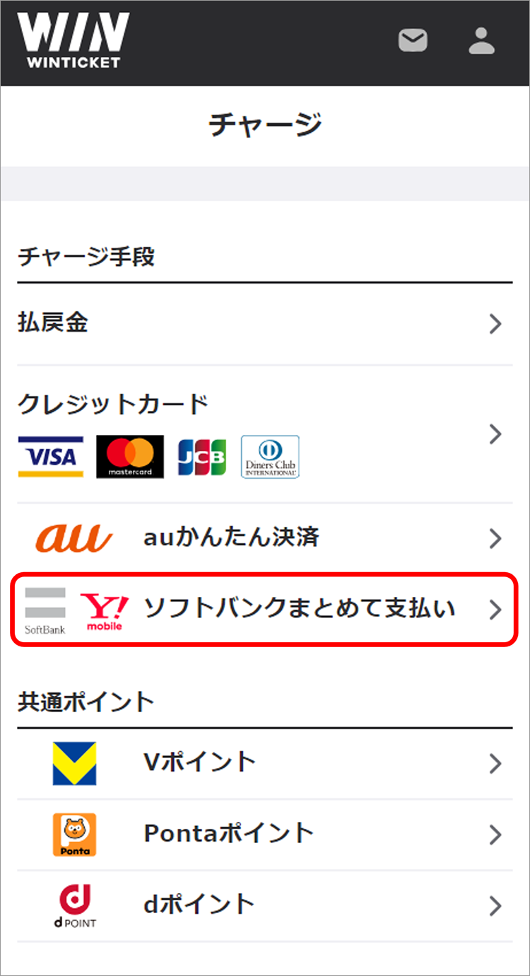1 チャージ選択時、「ソフトバンクまとめて支払い」を選択 -