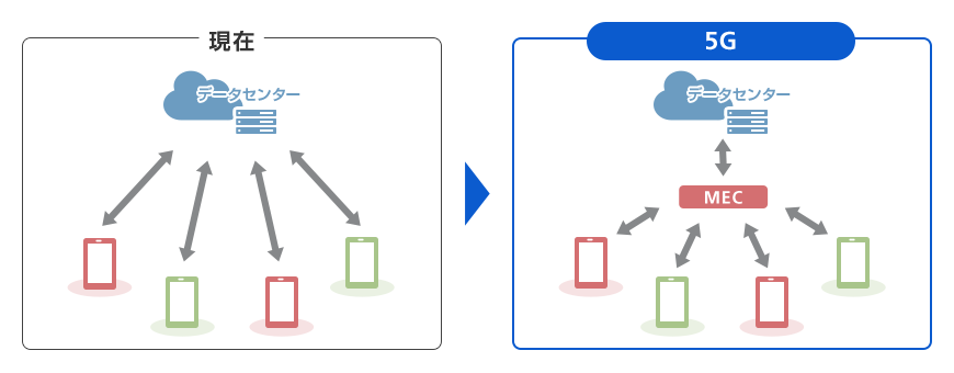 MEC(メック)とは、ユーザーの使うデバイスにより近い場所にサーバーの代わりをするコンピューターを置くことによって、通信の効率化を図る技術です。ユーザーに近い場所でデータ処理が行われるため、低遅延を実現することができます。