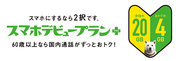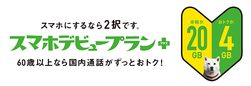 スマホにするなら2択です。スマホデビュープラン+ 60歳以上なら国内通話がずっとおトク! 余裕か。おトクか。 20GB 4GB スマホにするなら2択です。スマホデビュープラン+ 60歳以上なら国内通話がずっとおトク! 余裕か。おトクか。 20GB 4GB