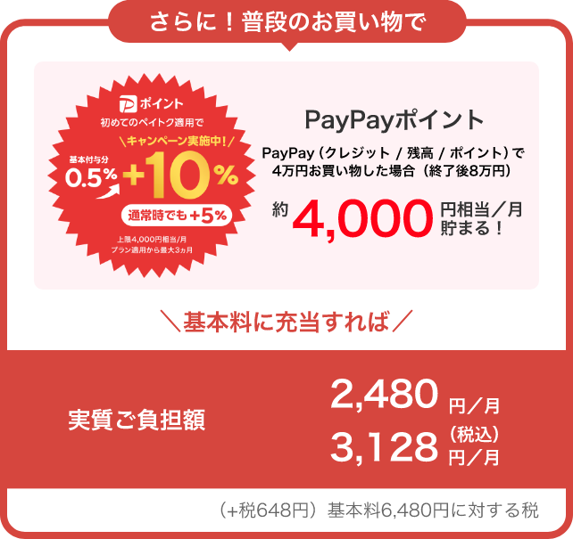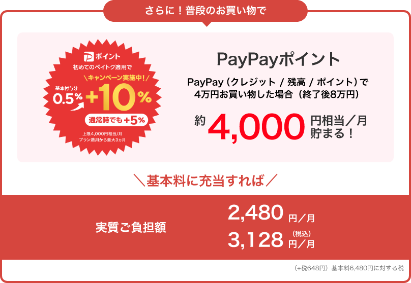 ふだんの買い物で驚くほど貯まる!★ ★PayPay(クレジット/残高/ポイント)での買い物で付与上限まで ポイントがっぽり料金プランペイト【「ペイトク無制限」適用時*】PayPayでの買い物で(クレジット/残高/ポイント) キャンペーン実施中はじめてのペイトク適用から最大3カ月+10%ポイントが貯まる!そのあともずーっと+5% *基本料税込9,625円/月 時間帯で速度制御有 テザリング含め月200GB~最大4.5Mbpsに制御 データシェア50GB迄 通信料、医療機関、調剤薬局等対象外 サービス有 「PayPayクレジット」「PayPay残高」「PayPayポイント」以外のPayPayカード、PayPayカード ゴールド、PayPay残高カードなどでのお支払いは対象外 付与するPayPayポイントは少数点以下切り捨て計算 PayPayポイントはPayPay/PayPayカード公式ストアでも利用可能 PayPayアプリにおけるアカウント連携が必要