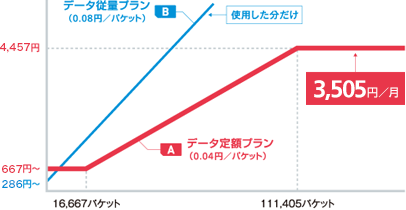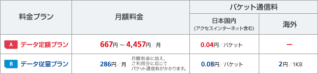 - それぞれ別々に加入した場合、データ定額プランは1,905円~5,696円/月(0.04円/パケット)、データ従量プランは4,267円/月+使用した通信料(0.08円/パケット)がかかります。
