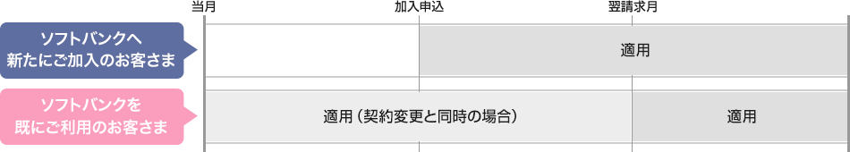 - ソフトバンクへ新たに加入されるお客さまがお申し込みの場合、加入日から適用となります。