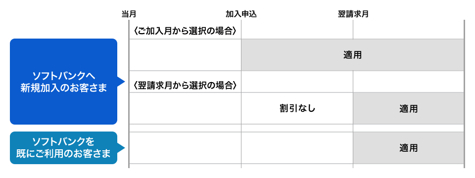 ソフトバンクへ新規加入と同時にお申し込みの場合は、適用開始を「加入日」または「翌請求月」からお選びいただけます。ソフトバンクを既にご利用中のお客さまがお申し込みの場合は、翌請求月からの適用となります。