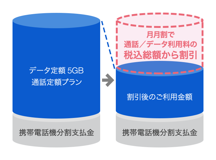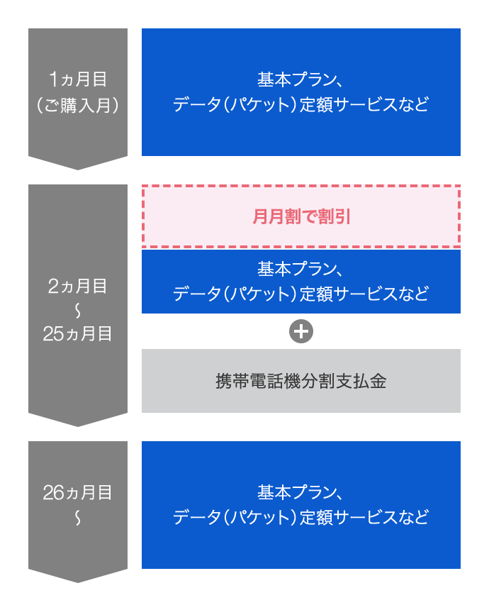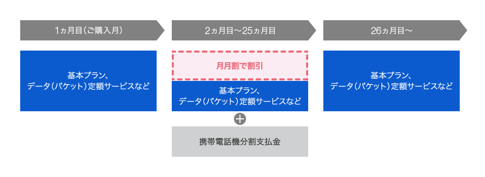 通話料・通信料などが24ヵ月間(ご購入2ヵ月目から25ヵ月目まで)割引になります。