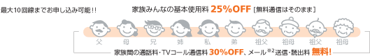 - 家族割引適用後であっても、当社基準により割引適用外であることが判明した場合は、当該回線または家族割引グループの一部もしくは全回線の家族割引の適用を取り消しさせて頂きます。