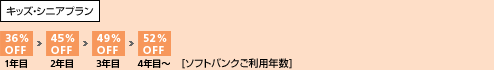ソフトバンクを既にご利用中のお客さまがお申し込みの場合は、翌請求月からの適用となります(年間割引の解除も同様となります)。 - ※2キッズ・シニアプランの4年目以降の基本使用料割引率。