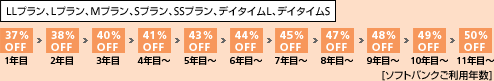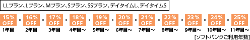 - 基本使用料割引率はソフトバンクご利用年数(新規でご契約いただいた日からの期間)を適用いたします。