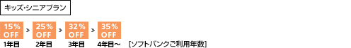 ソフトバンクを既にご利用中のお客さまがお申し込みの場合は、翌請求月からの適用となります(年間割引の解除も同様となります)。 - ※2キッズ・シニアプランの4年目以降の基本使用料割引率。