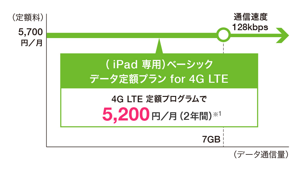 - ※1「4G LTE定額プログラム」適用の場合。「4G LTE定額プログラム」の適用には、SoftBank 4G LTE 及び SoftBank 4G 対応の iPad のご購入と同時に「(iPad 専用)ベーシックデータ定額プラン for 4G LTE」へのご加入が必要です。「4G LTE定額プログラム」が適用とならない場合、定額料は5,700円/月となります。プログラムの内容および期間は、予告なく変更する場合があります。
