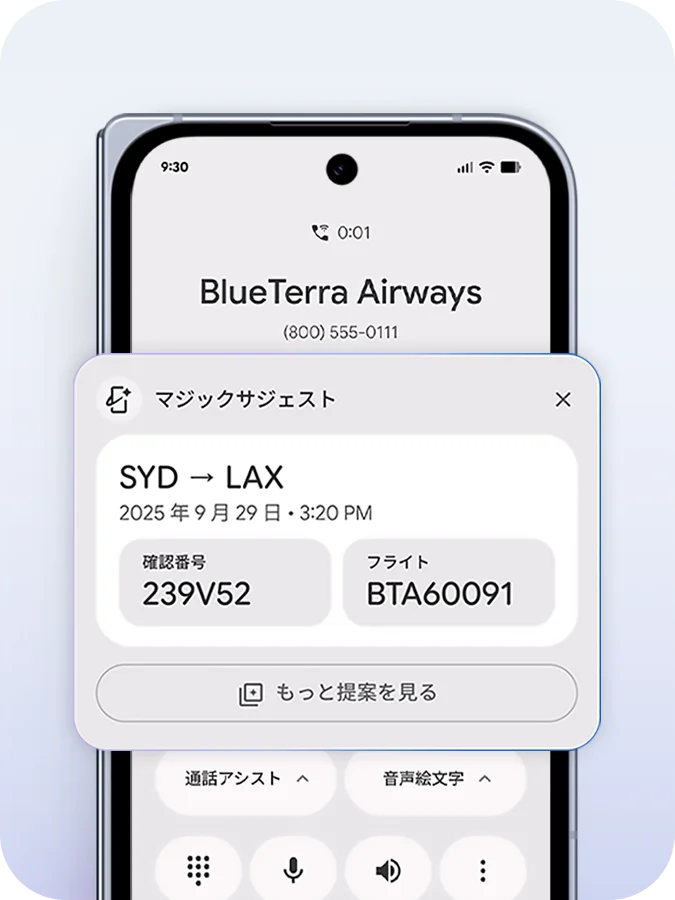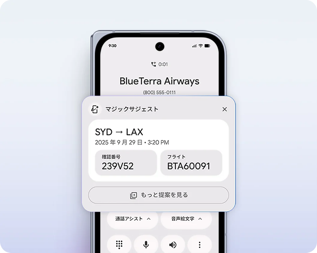 マジックサジェストは、関連性の高い情報や役立つ機能が AI の予想に基づいて提案され、ユーザーのデジタルライフがより便利になる機能です4。たとえば、あなたが航空会社に電話しようとすると、メールからフライト情報が検索されて表示されます4。