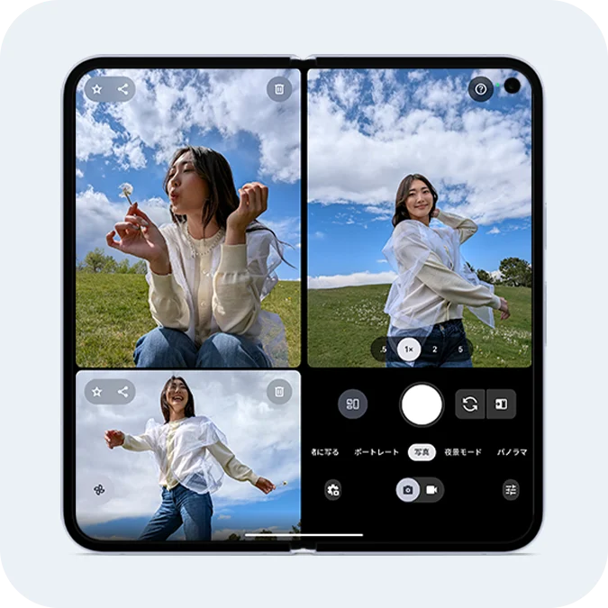スマートフォンを開くと、内側の ディスプレイの片側に撮影した写真が表示され、反対側でこれから撮影するものを確認することが可能。撮影しながら、撮った写真と撮ろうとする写真が表示されます。