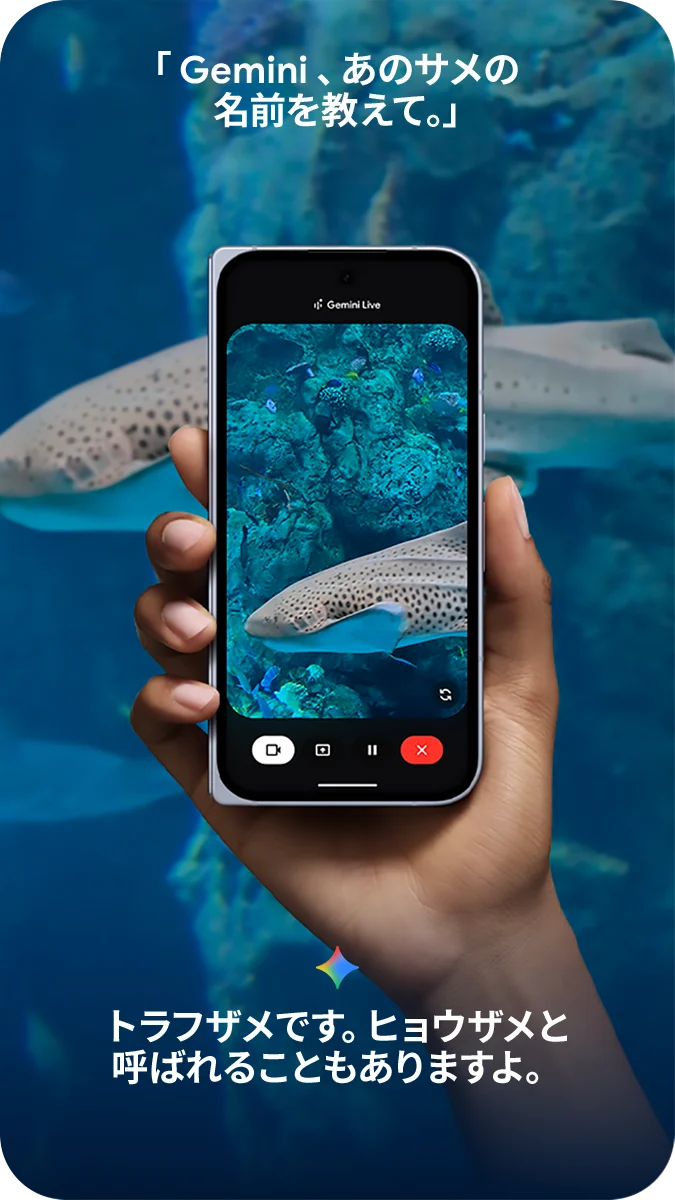 Gemini Live で、水族館の海の生き物など興味を引かれたものにカメラを向けると、Gemini と自然に会話しながら知識を深められます5。