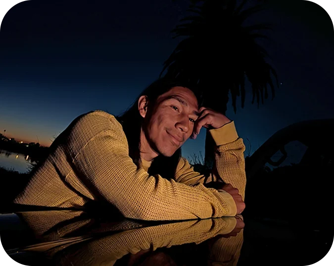 夜景モードを使えば、コンサート会場や夜の街などの暗いシーンでも、ポートレートからパノラマまで、くっきり鮮明に撮影できます。スマートフォンをテーブルトップ モードにセットすれば、三脚を使わずに天体写真やタイムラプスが写せます。