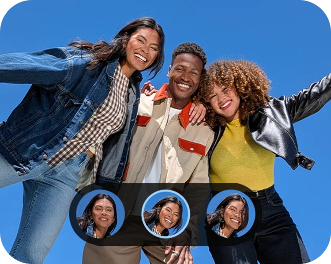 集合写真を撮影したら、似ている写真を自動で見つけて組み合わせ、全員が良い表情をしている集合写真に仕上げられます。