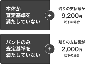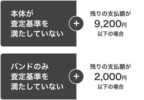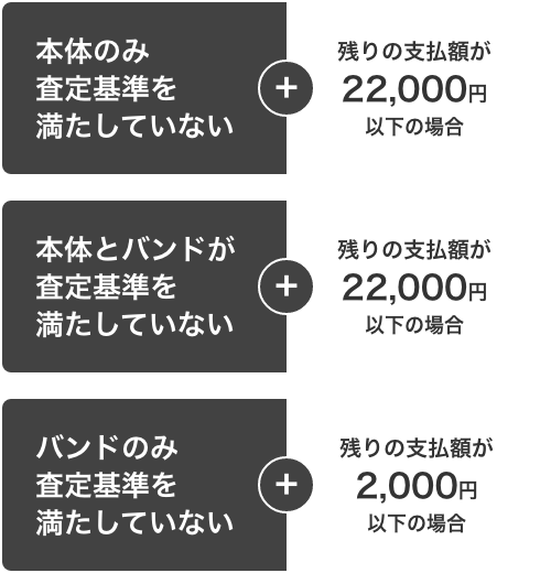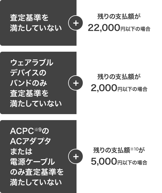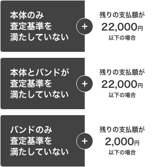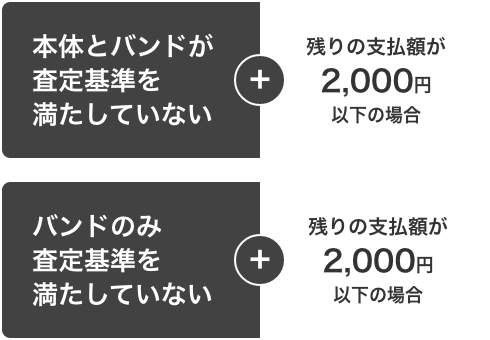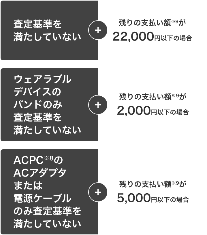- 査定条件を満たさない場合、機種の回収に加えて22,000円(不課税)の支払いが必要です。なお、ウェアラブルデバイスの本体は査定基準を満たすがバンドのみが満たさないときは2,000円(不課税)のお支払いが必要です。