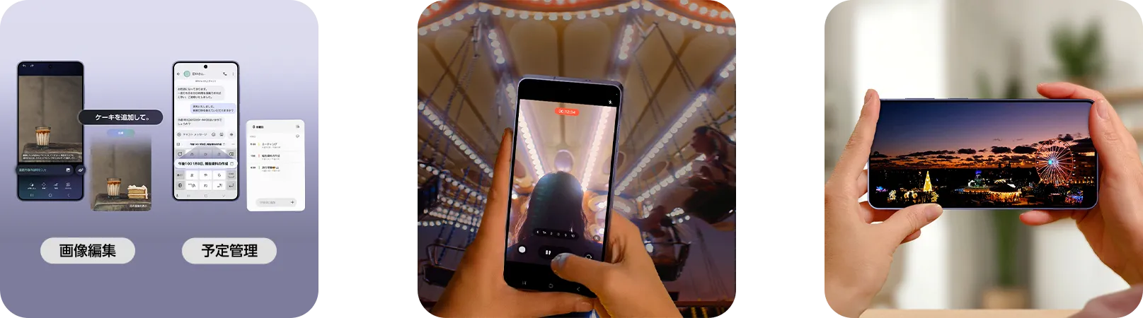 - *1フォトアシストはネットワークへの接続とSamsungアカウントへのログインが必要です。フォトアシストで編集すると、画像がリサイズされます。画像がAIによって生成されたことを示すために、保存時に出力画像にウォーターマークが重ねられます。(特許ブランドやキャラクターコンテンツの複製を防止するための措置が講じられていますが、複製の回避を保証するものではありません。)生成された出力画像の正確性と信頼性は保証いたしません。