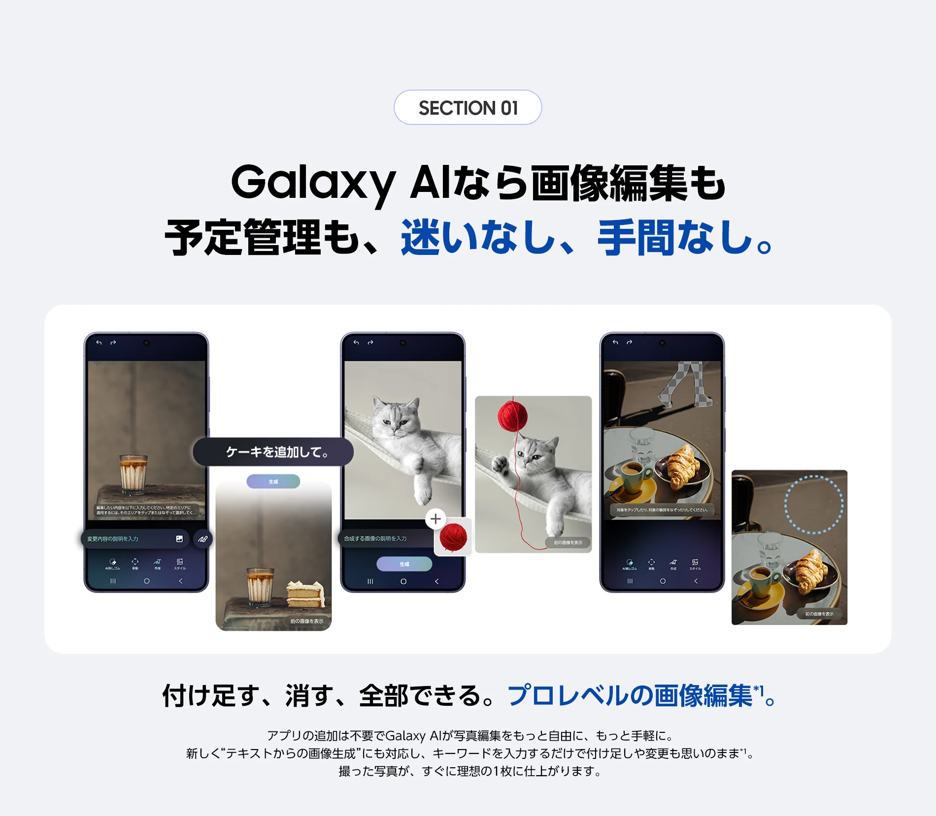 フォトアシストはネットワークへの接続とSamsungアカウントへのログインが必要です。フォトアシストで編集すると、画像がリサイズされます。画像がAIによって生成されたことを示すために、保存時に出力画像にウォーターマークが重ねられます。(特許ブランドやキャラクターコンテンツの複製を防止するための措置が講じられていますが、複製の回避を保証するものではありません。)生成された出力画像の正確性と信頼性は保証いたしません。