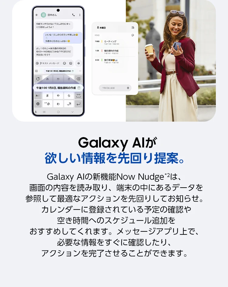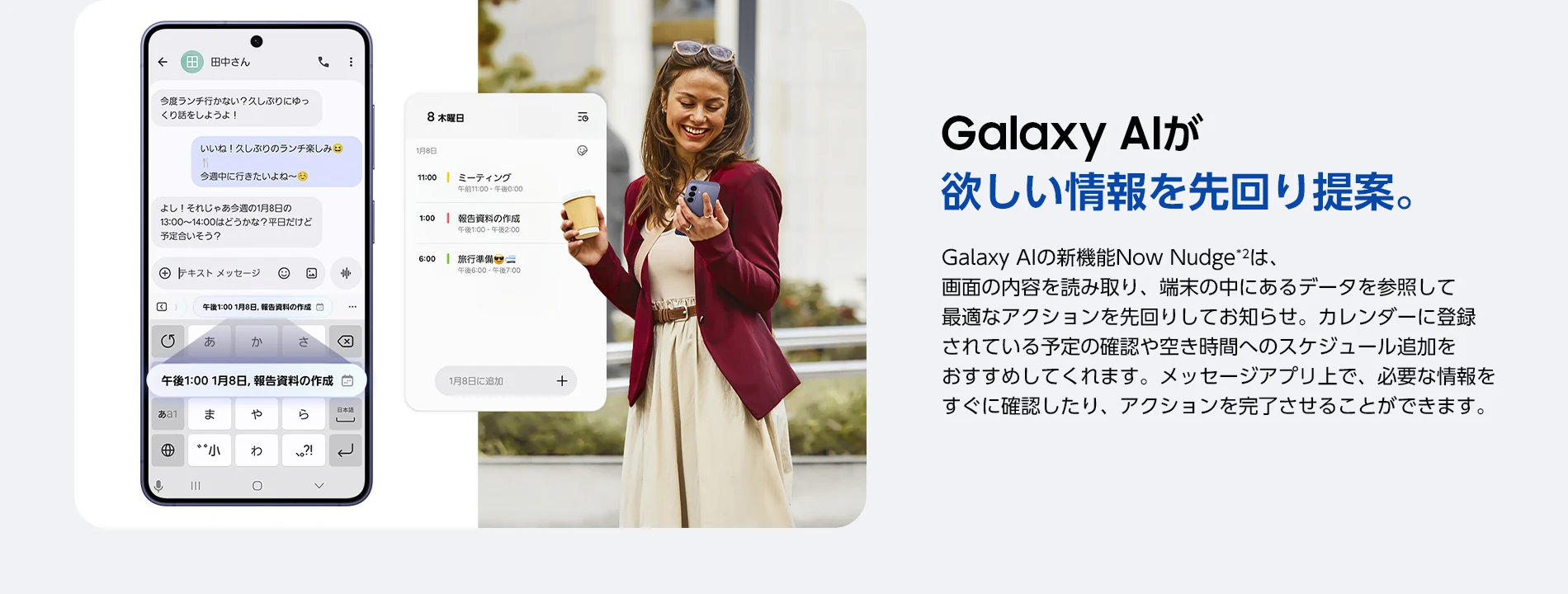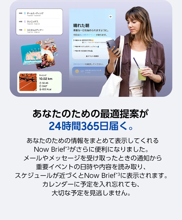 「Now Brief」機能を使用するには、Samsungアカウントへのログインが必要です。サービスの利用可否は、国や地域、言語、デバイスモデル、アプリによって異なる場合があります。コンテキストに応じたルーチンの提案で、Personal Data Engineを使うには、モードとルーチンを有効にする必要があります。