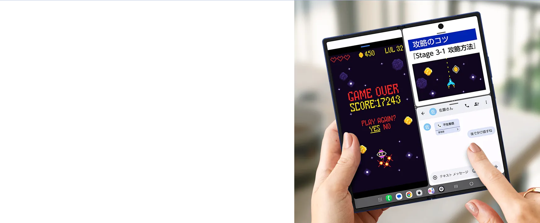 開けば約8.0インチの超大画面。端まで広がる全面ディスプレイでゲームやマルチタスク*2を