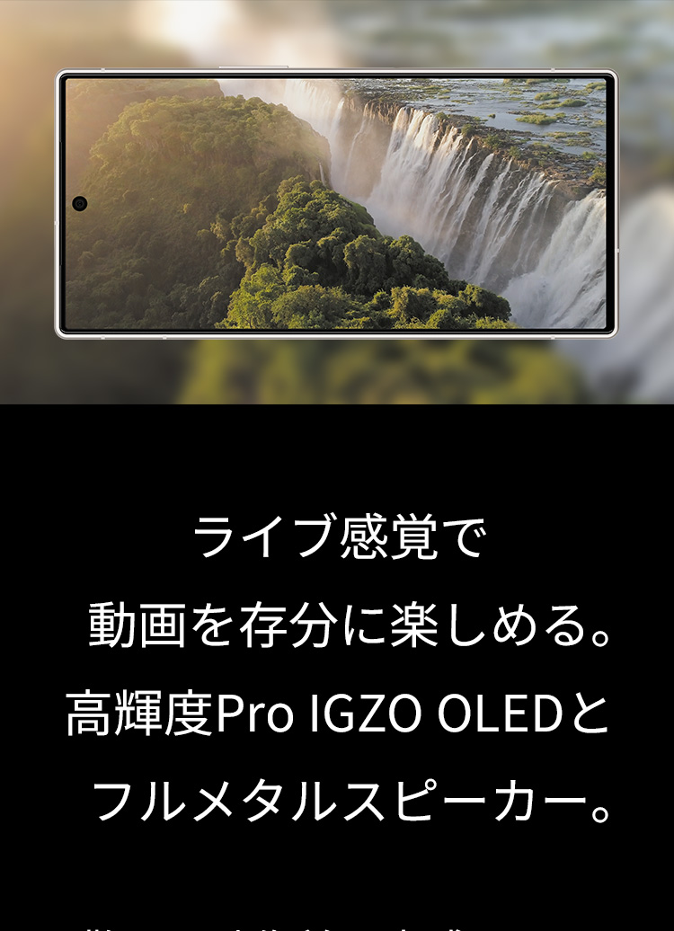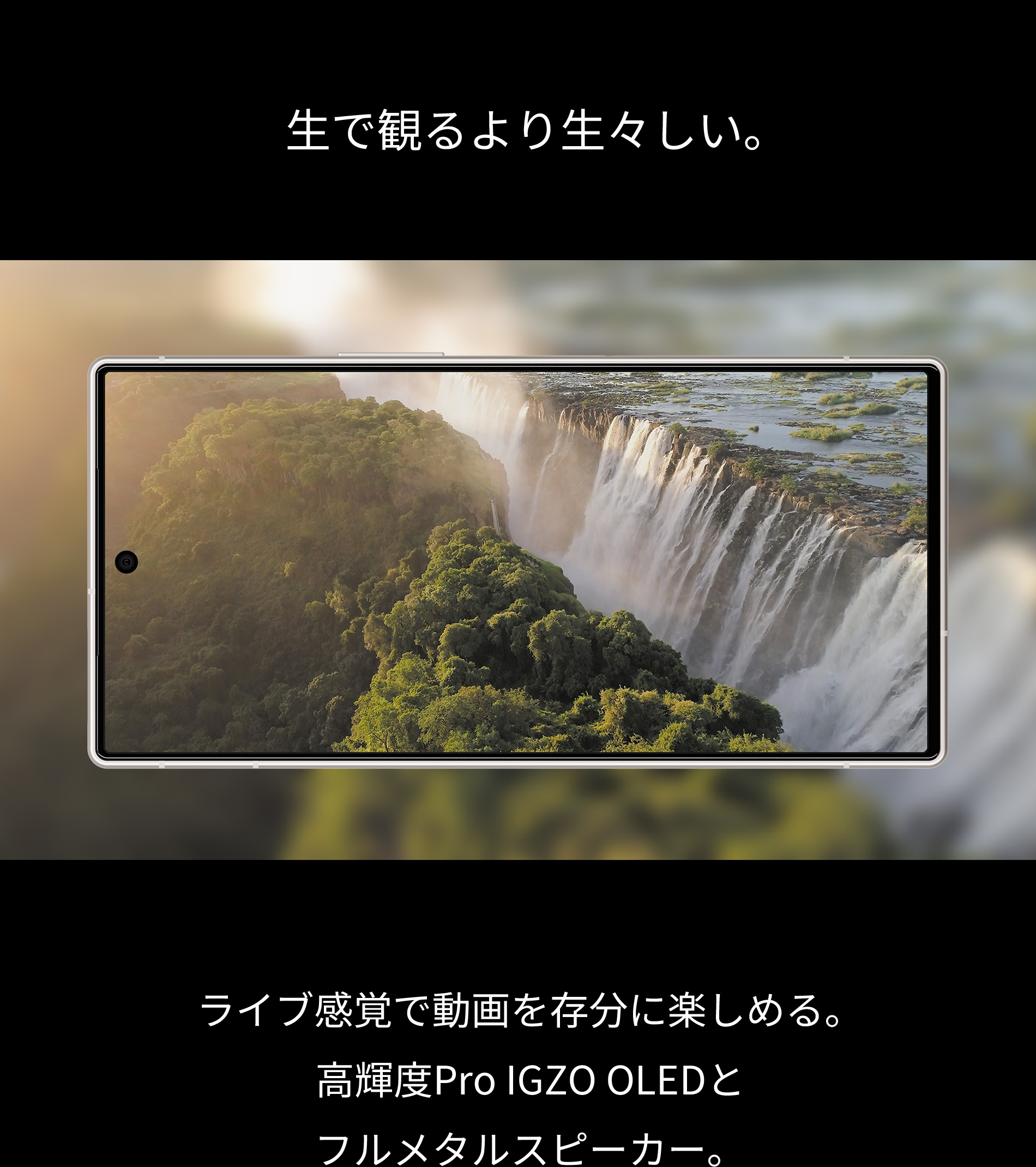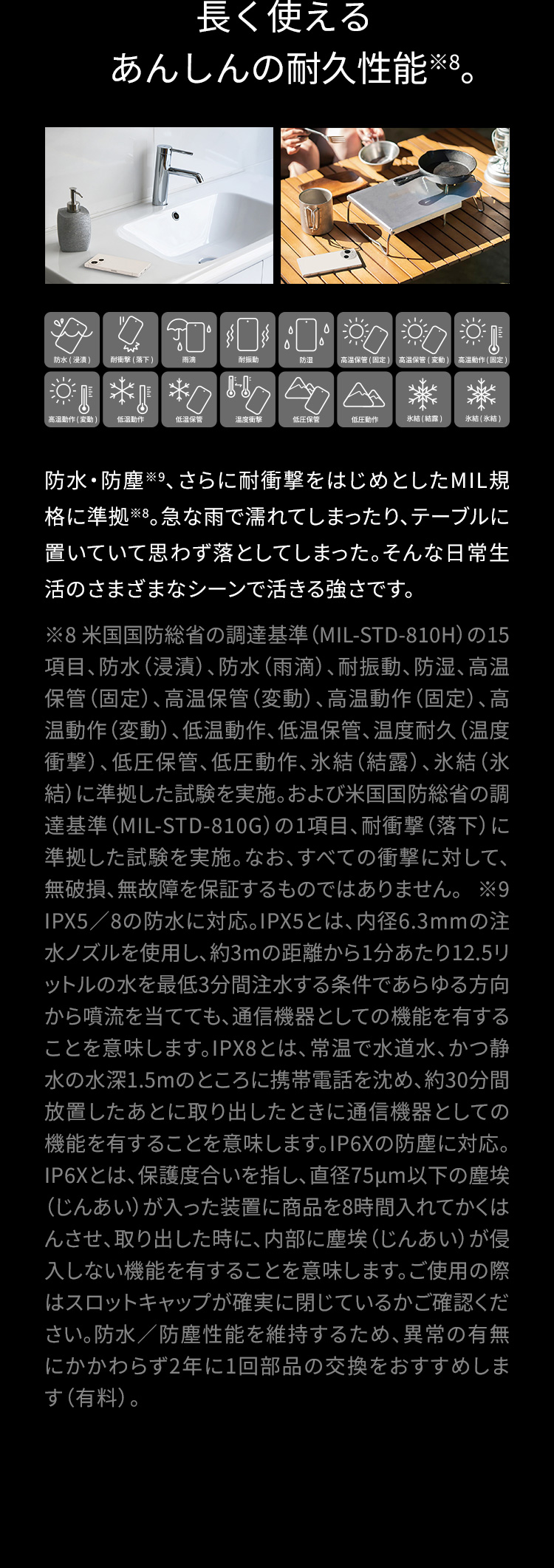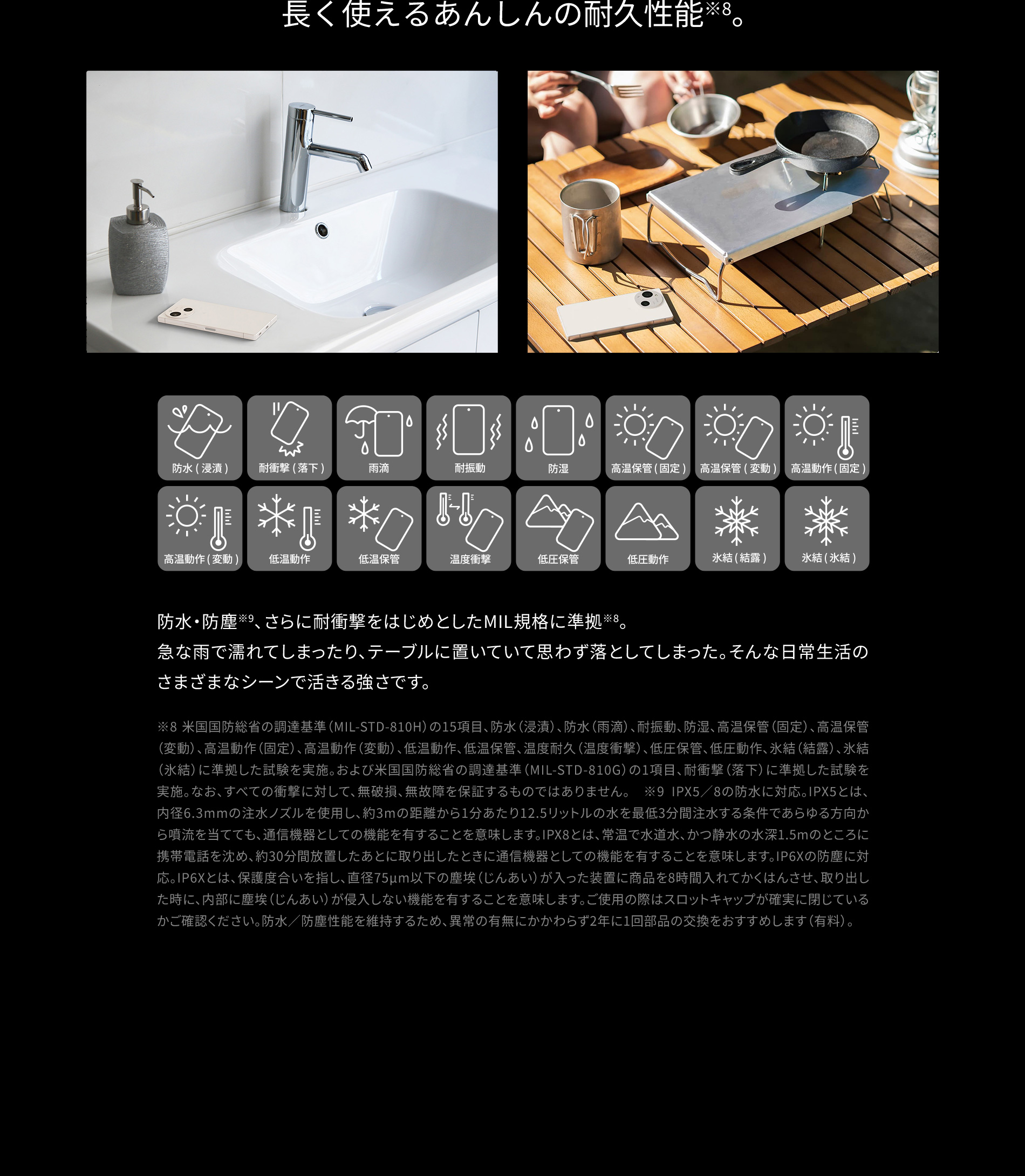 ※8 米国国防総省の調達基準(MIL-STD-810H)の15項目、防水(浸漬)、防水(雨滴)、耐振動、防湿、高温保管(固定)、高温保管(変動)、高温動作(固定)、高温動作(変動)、低温動作、低温保管、温度耐久(温度衝撃)、低圧保管、低圧動作、氷結(結露)、氷結(氷結)に準拠した試験を実施。および米国国防総省の調達基準(MIL-STD-810G)の1項目、耐衝撃(落下)に準拠した試験を実施。なお、すべての衝撃に対して、無破損、無故障を保証するものではありません。 ※9 IPX5/8の防水に対応。IPX5とは、内径6.3mmの注水ノズルを使用し、約3mの距離から1分あたり12.5リットルの水を最低3分間注水する条件であらゆる方向から噴流を当てても、通信機器としての機能を有することを意味します。IPX8とは、常温で水道水、かつ静水の水深1.5mのところに携帯電話を沈め、約30分間放置したあとに取り出したときに通信機器としての機能を有することを意味します。IP6Xの防塵に対応。IP6Xとは、保護度合いを指し、直径75µm以下の塵埃(じんあい)が入った装置に商品を8時間入れてかくはんさせ、取り出した時に、内部に塵埃(じんあい)が侵入しない機能を有することを意味します。ご使用の際はスロットキャップが確実に閉じているかご確認ください。防水/防塵性能を維持するため、異常の有無にかかわらず2年に1回部品の交換をおすすめします(有料)。