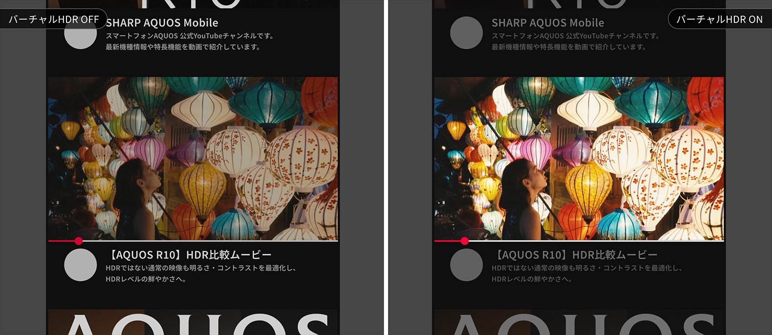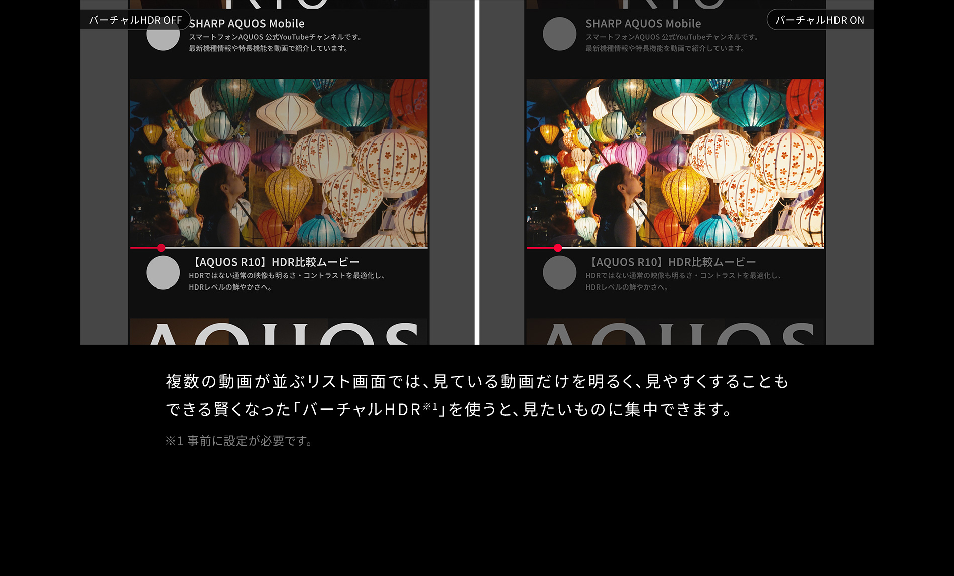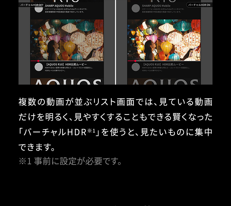 複数の動画が並ぶリスト画面では、見ている動画だけを明るく、見やすくすることもできる賢くなった「バーチャルHDR※1」を使うと、見たいものに集中できます。