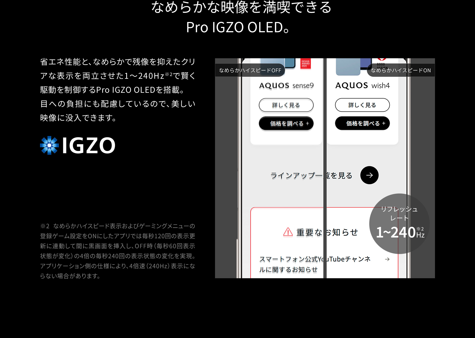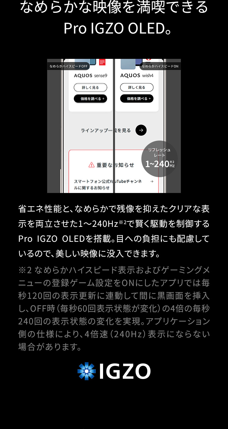 省エネ性能と、なめらかで残像を抑えたクリアな表示を両立させた1~240Hz※2で賢く駆動を制御するPro IGZO OLEDを搭載。