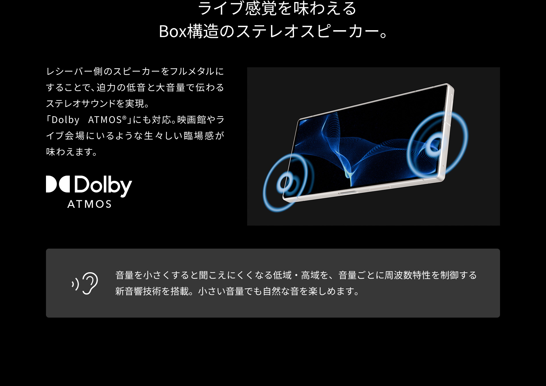 音量を小さくすると聞こえにくくなる低域・高域を、音量ごとに周波数特性を制御する新音響技術を搭載。小さい音量でも自然な音を楽しめます。