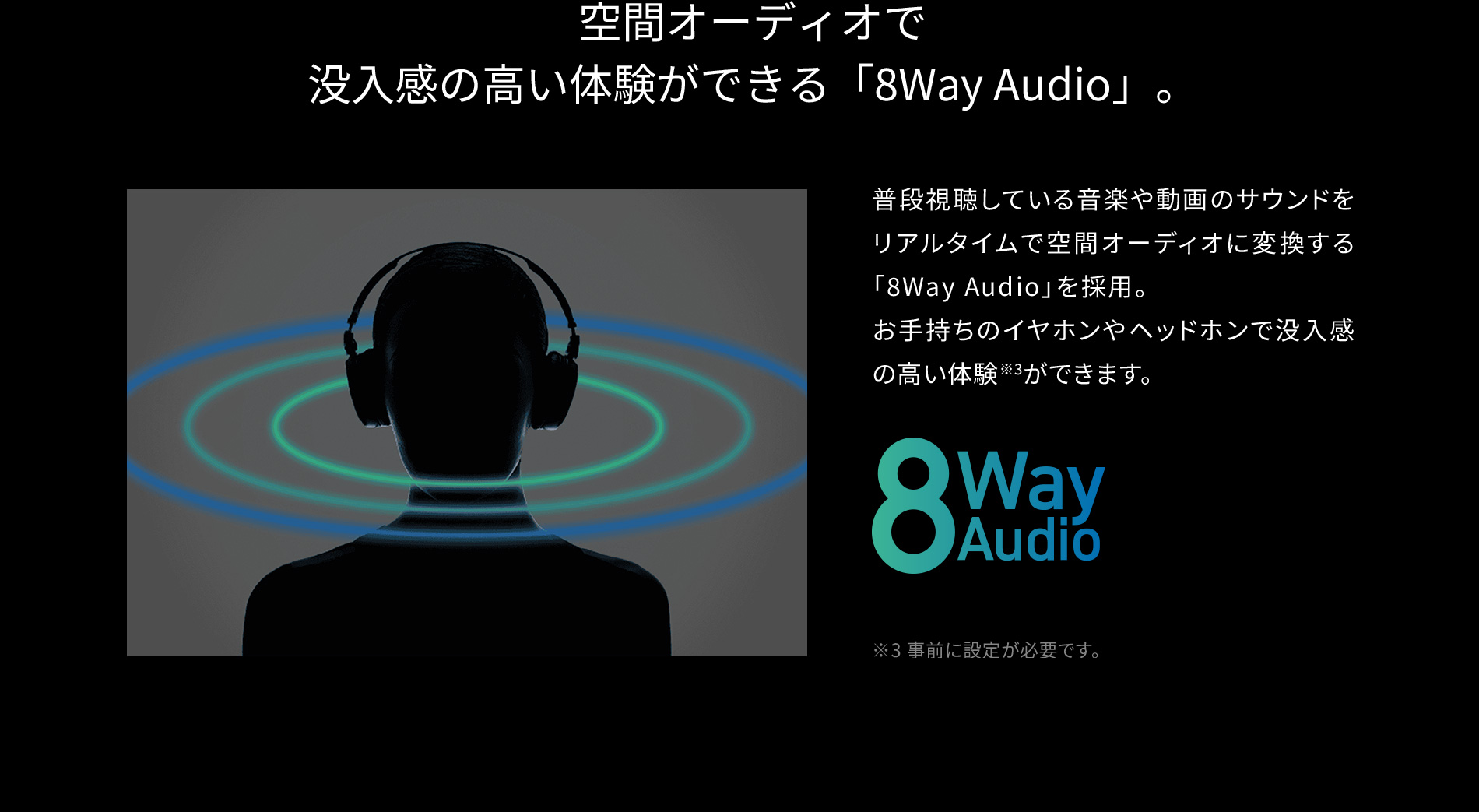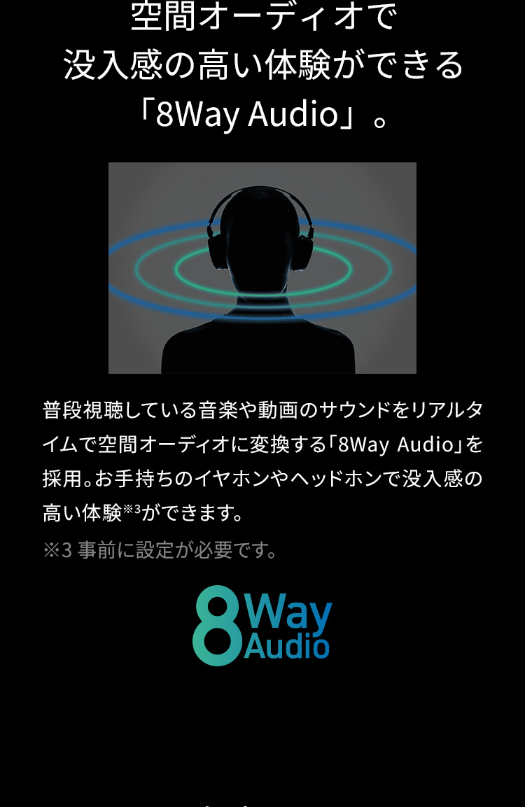 普段視聴している音楽や動画のサウンドをリアルタイムで空間オーディオに変換する「8Way Audio」を採用。お手持ちのイヤホンやヘッドホンで没入感の高い体験※3ができます。