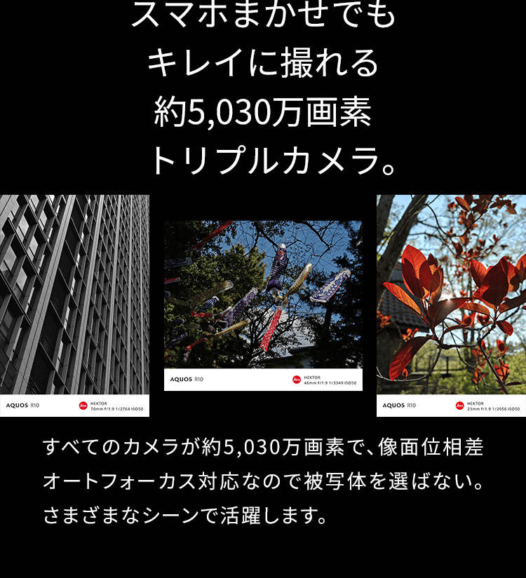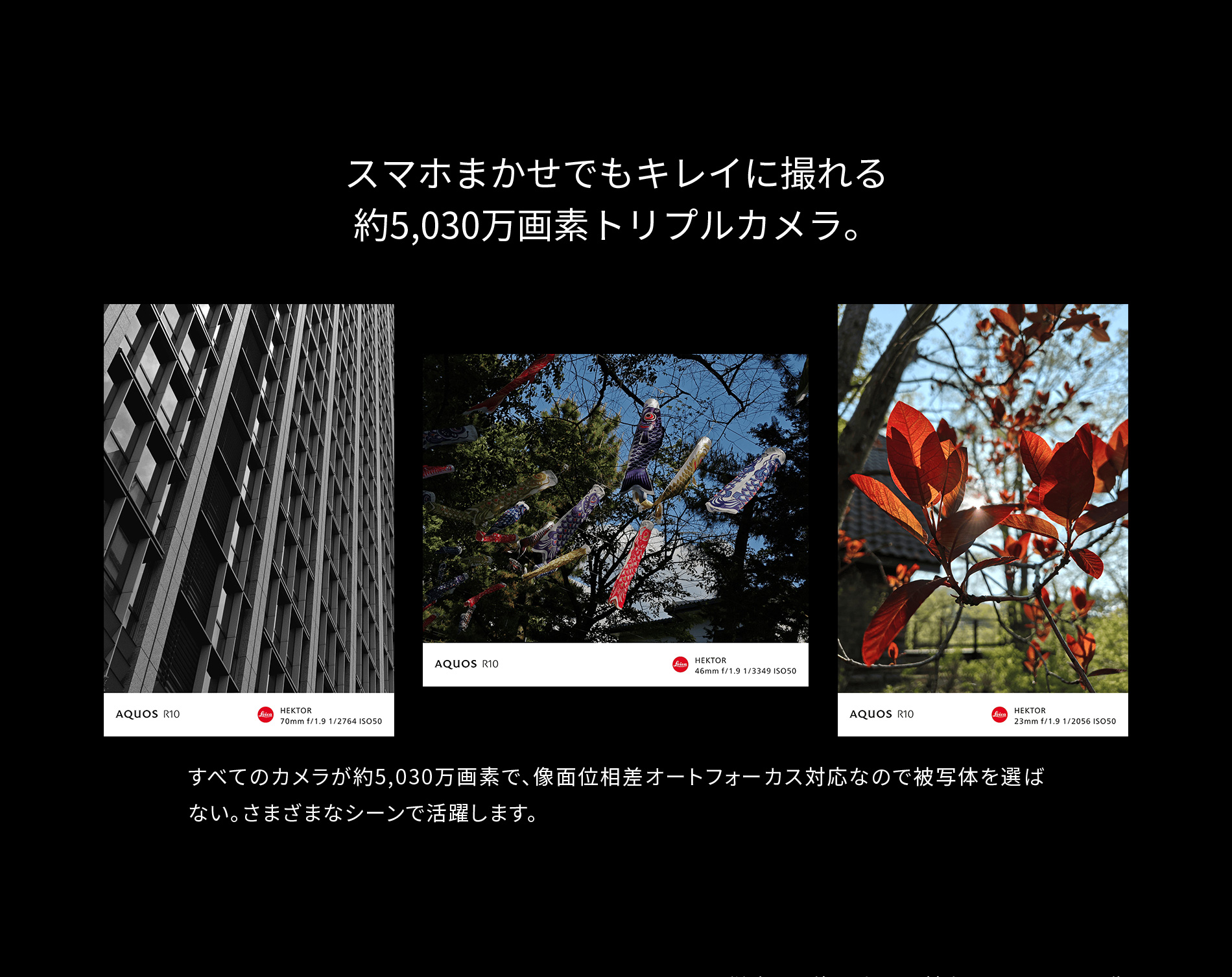 すべてのカメラが約5,030万画素で、像面位相差オートフォーカス対応なので被写体を選ばない。さまざまなシーンで活躍します。