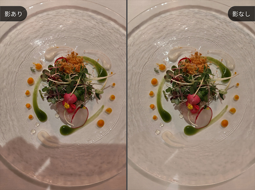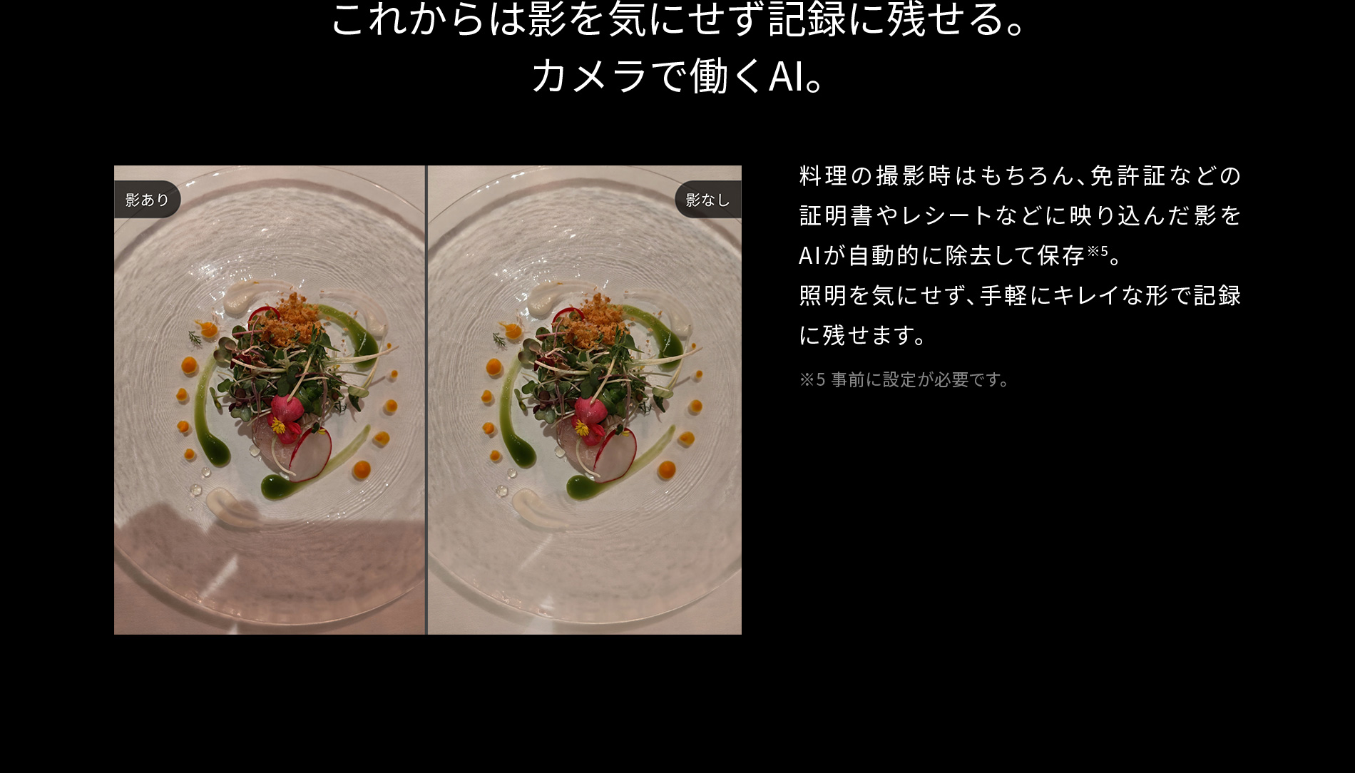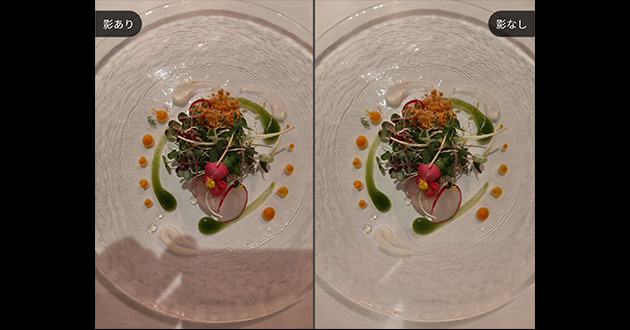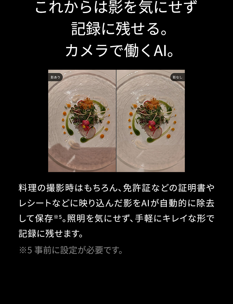 料理の撮影時はもちろん、免許証などの証明書やレシートなどに映り込んだ影をAIが自動的に除去して保存※5。
