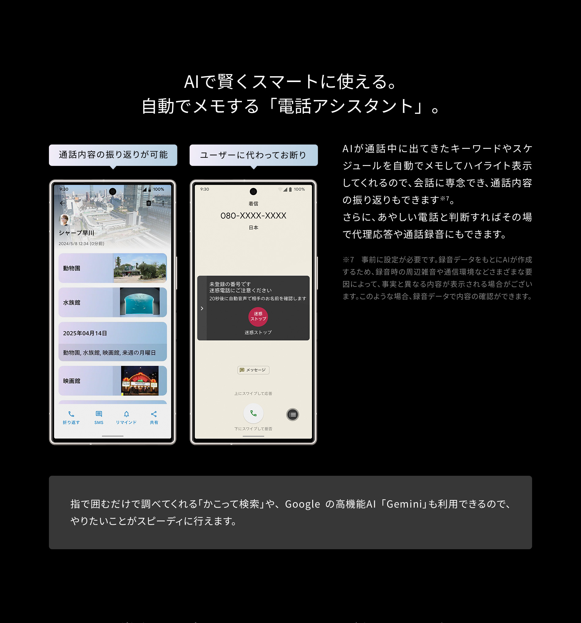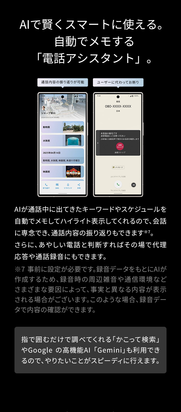 AIが通話中に出てきたキーワードやスケジュールを自動でメモしてハイライト表示してくれるので、会話に専念でき、通話内容の振り返りもできます※7。