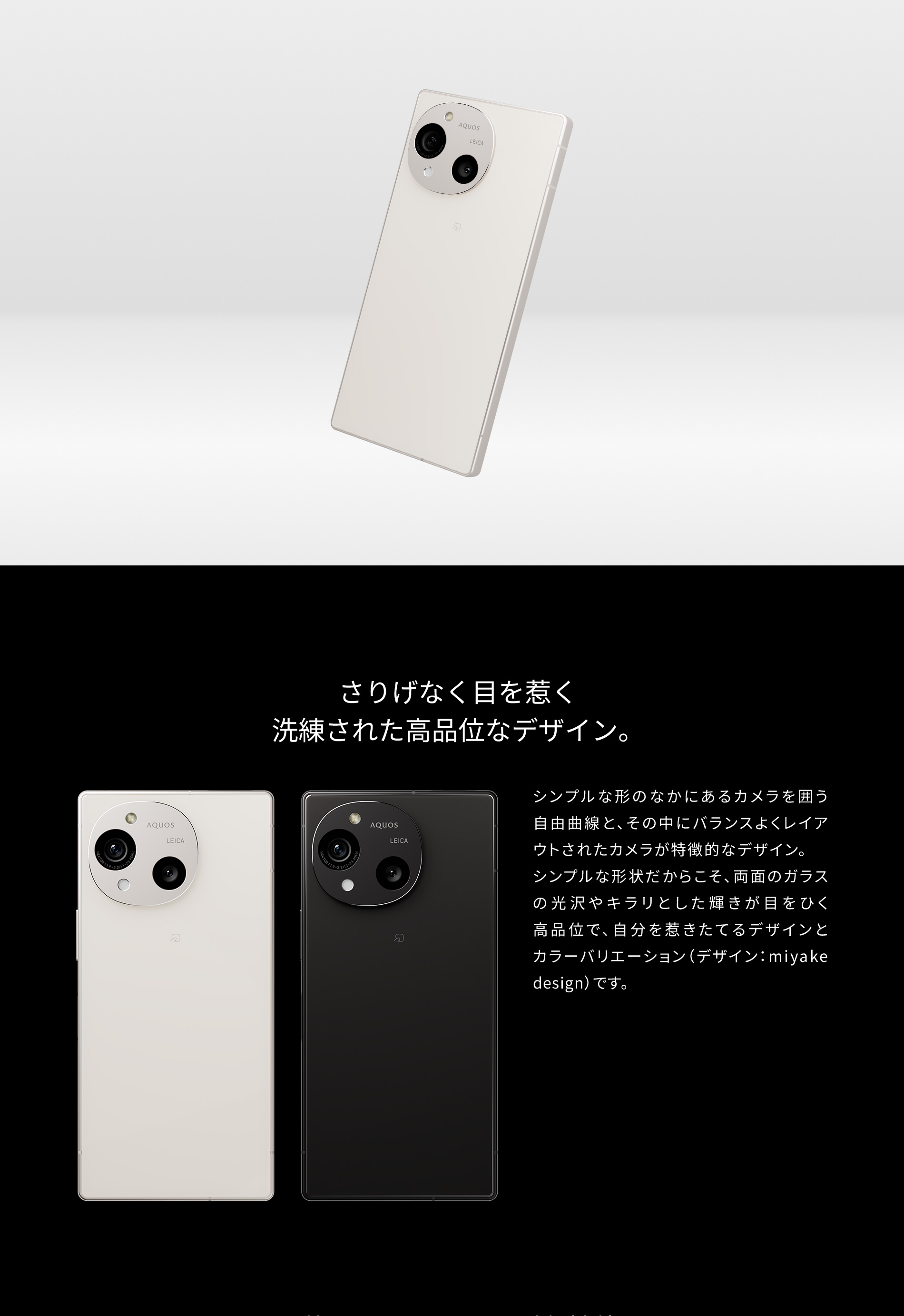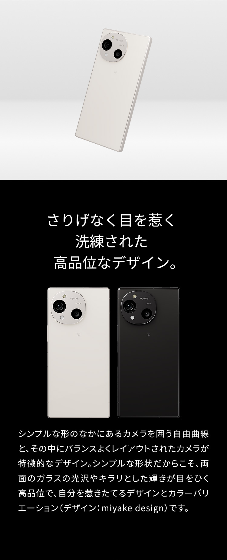 シンプルな形のなかにあるカメラを囲う自由曲線と、その中にバランスよくレイアウトされたカメラが特徴的なデザイン。シンプルな形状だからこそ、両面のガラスの光沢やキラリとした輝きが目をひく高品位で、自分を惹きたてるデザインとカラーバリエーション(デザイン:miyake design)です。