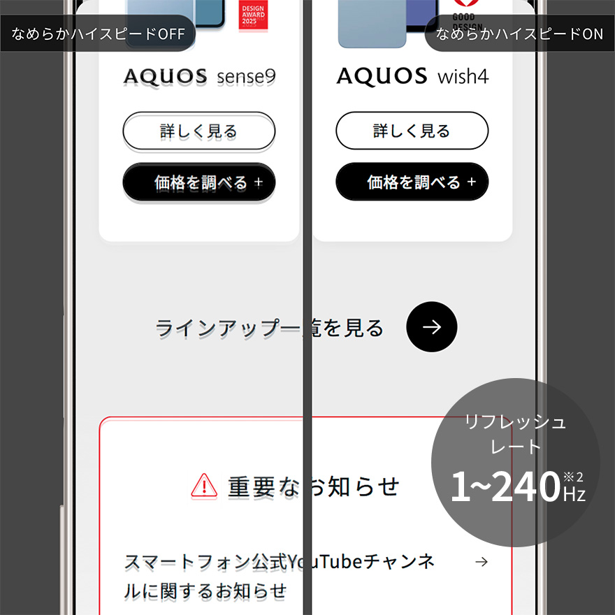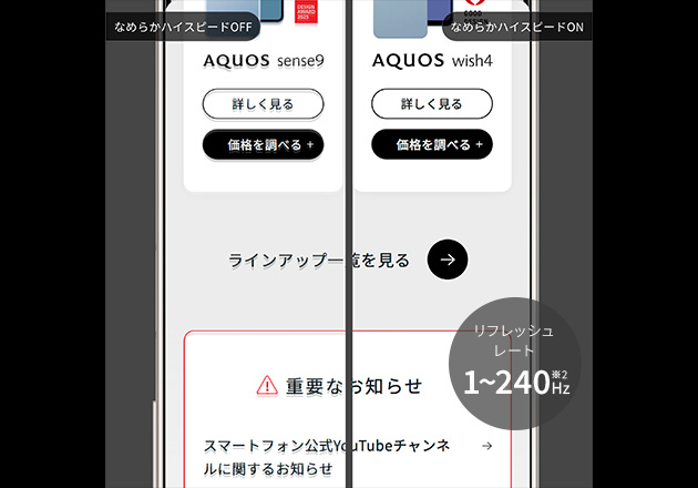 ※2 なめらかハイスピード表示およびゲーミングメニューの登録ゲーム設定をONにしたアプリでは毎秒120回の表示更新に連動して間に黒画面を挿入し、OFF時(毎秒60回表示状態が変化)の4倍の毎秒240回の表示状態の変化を実現。アプリケーション側の仕様により、4倍速(240Hz)表示にならない場合があります。