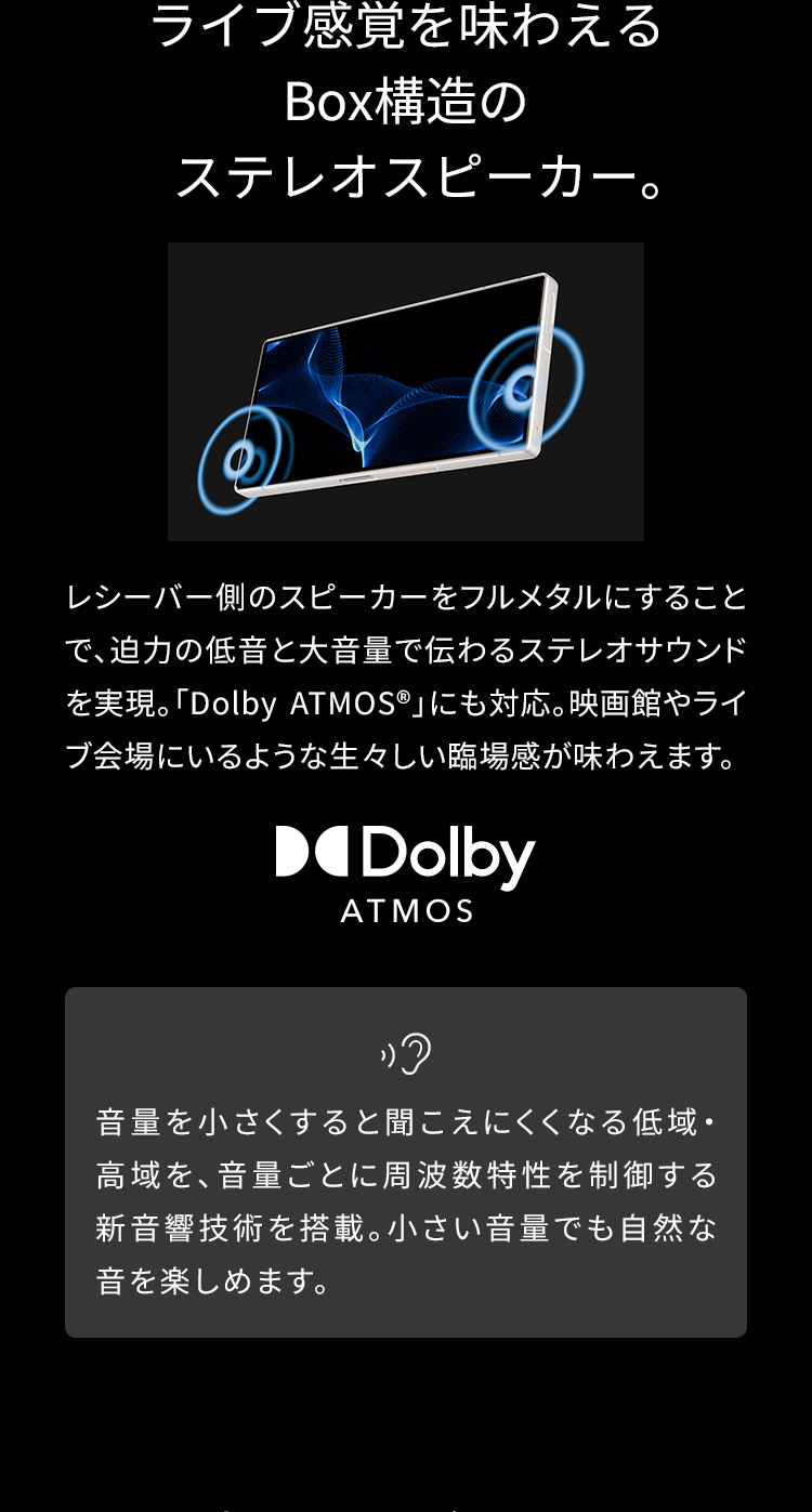 レシーバー側のスピーカーをフルメタルにすることで、迫力の低音と大音量で伝わるステレオサウンドを実現。「Dolby ATMOS®」にも対応。映画館やライブ会場にいるような生々しい臨場感が味わえます。