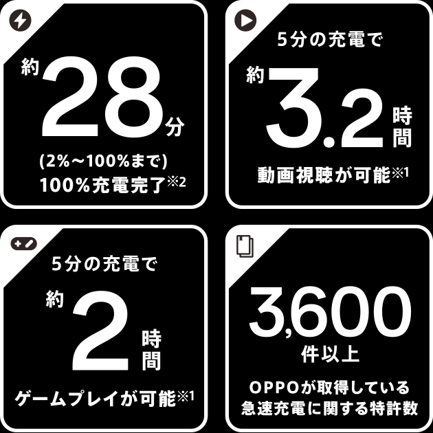 OPPO実験室で収集されたデータに基づいています。お客様の使用状況や使用環境によって異なります。