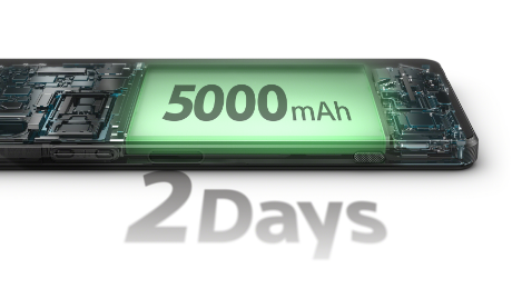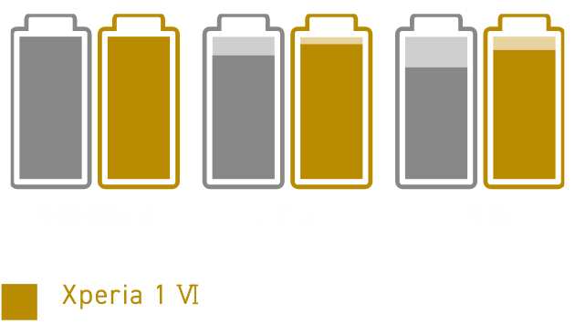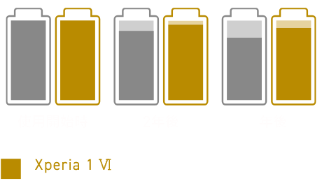 Xperiaユーザーのバッテリー使用プロファイル標準値から、インターネット閲覧・動画閲覧・ゲーム・その他の機能を1日あたり360分利用(1080分の待機時間)することを想定したテストで、48時間利用してもバッテリーが残ることを意味します。実際のバッテリー残量はお客さまのご使用環境やご利用状況によって異なります。
