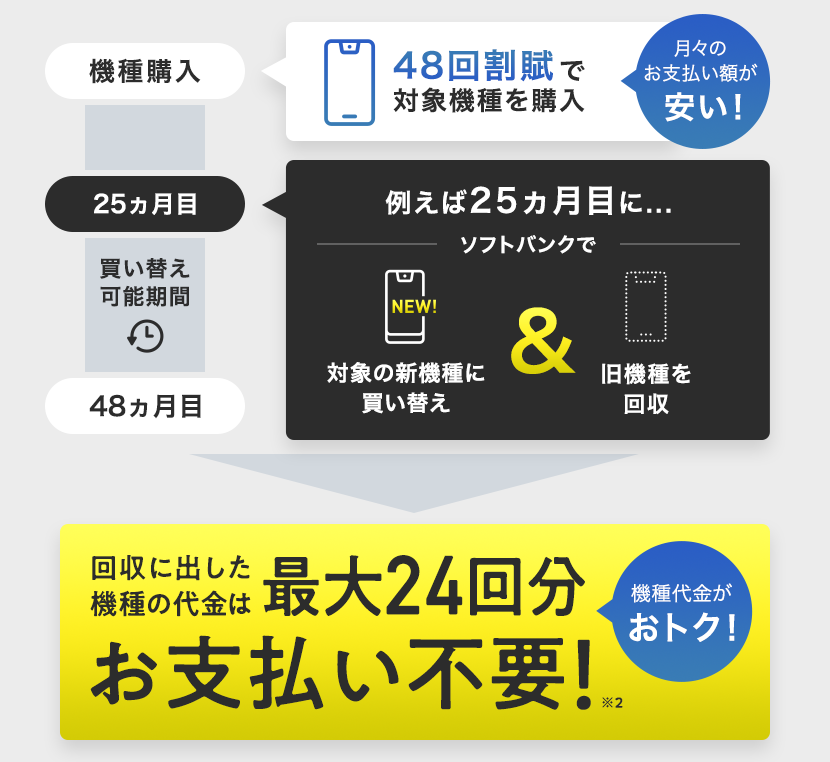 特典Aは、48回割賦で対象機種を購入し、特典受付開始日以降に、ソフトバンクで指定機種へ買い替え、旧機種を回収・査定完了する等の特典利用条件を満たした場合に、旧機種の査定完了日が属する請求月の翌請求月以降分の分割支払金・賦払金(最大24回分、頭金は対象外)のお支払いを不要とするものです。