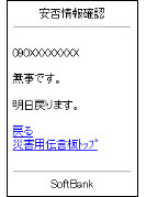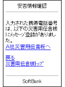- ご家族や知人がソフトバンク以外の災害用伝言板で安否情報登録を行った場合、お手持ちのソフトバンク携帯電話やパソコンから安否情報を確認することが可能です。