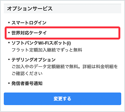 My SoftBankの「オプションサービス」欄で「世界対応ケータイ」をご確認ください。