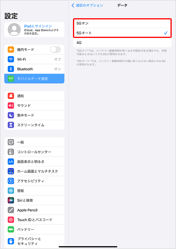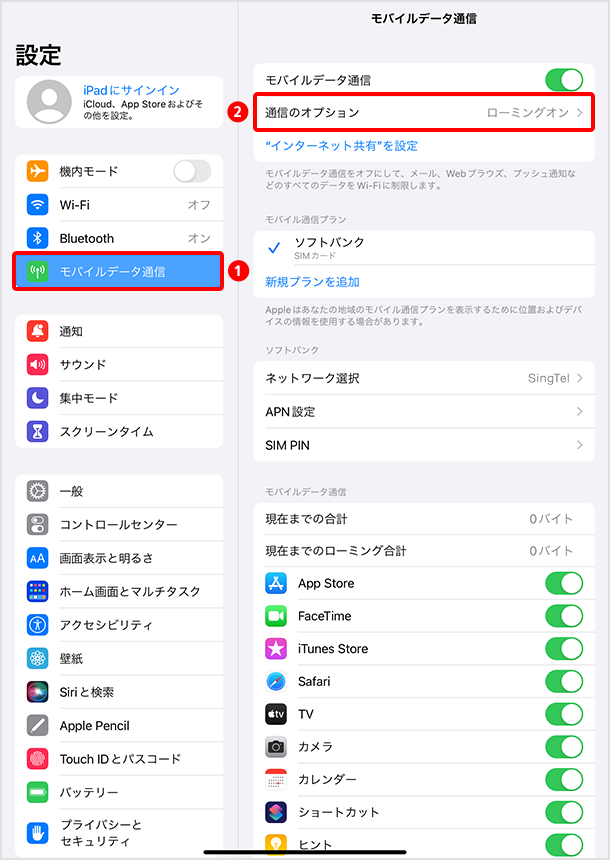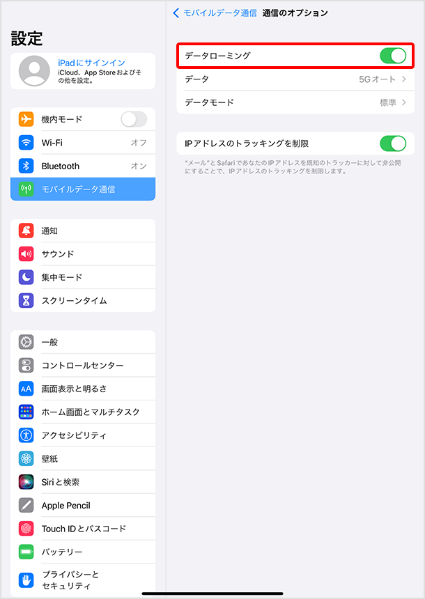 - 「モバイルデータ通信」が「オフ」の場合は「オン」にしてください。