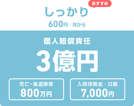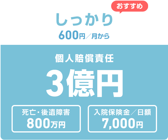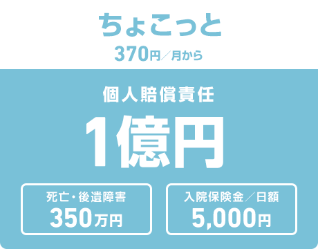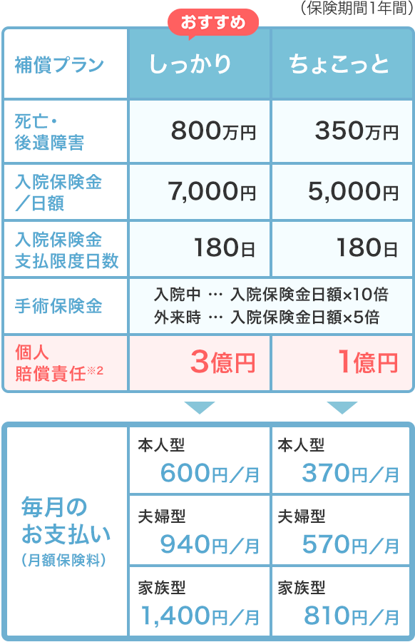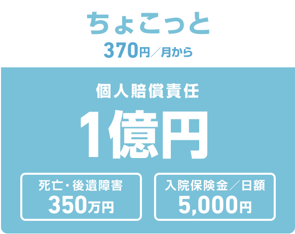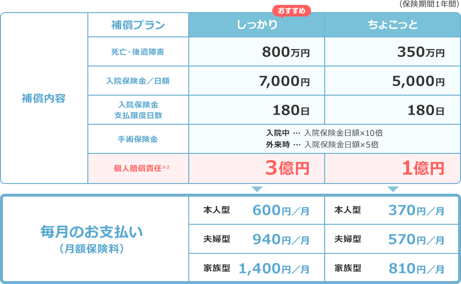 「ちょこっと」と「しっかり」の補償プランをご用意。近年増加傾向の高額賠償に備える「しっかり」プランは補償内容が充実したおすすめのプランです。